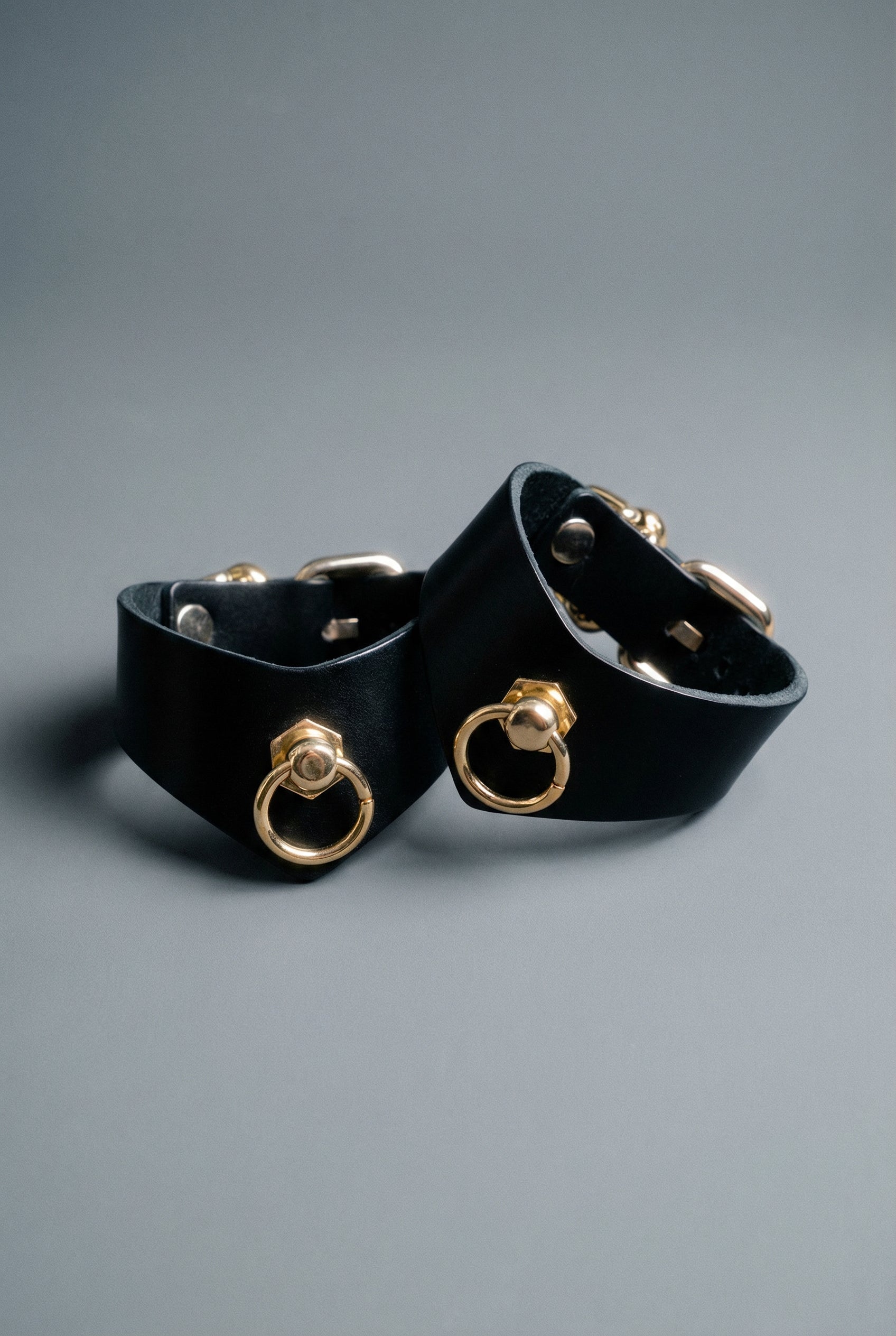 Slip them on and feel the transformation: slim, tailored bands hug your wrists with a whisper of rebellion, while the gleaming hardware (choose all black for pure attitude or black/gold for a splash of decadence) turns every look into a power move. The buckle closures ensure a flawless, custom fit — tight enough for serious play, comfortable enough for all-day wear.
